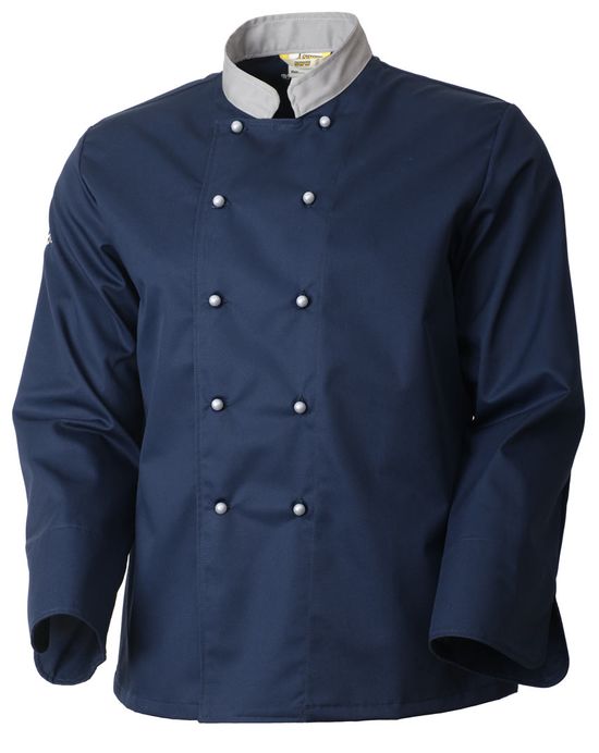 Китель повара темно-синий с серым воротником унисекс 379A-MU-15/57 из износостойкого стопроцентного хлопка плотностью 260 граммов на квадратный метр. Двубортная застёжка на пукли. Пукли идут в комплекте.
