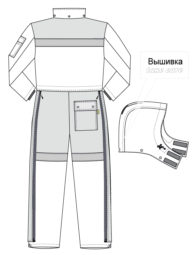 - Два ряда световозвращающей ленты (50 мм) на уровне кокеток и на штанинах выше уровня колена.