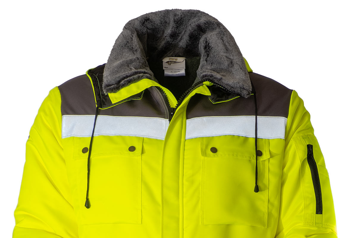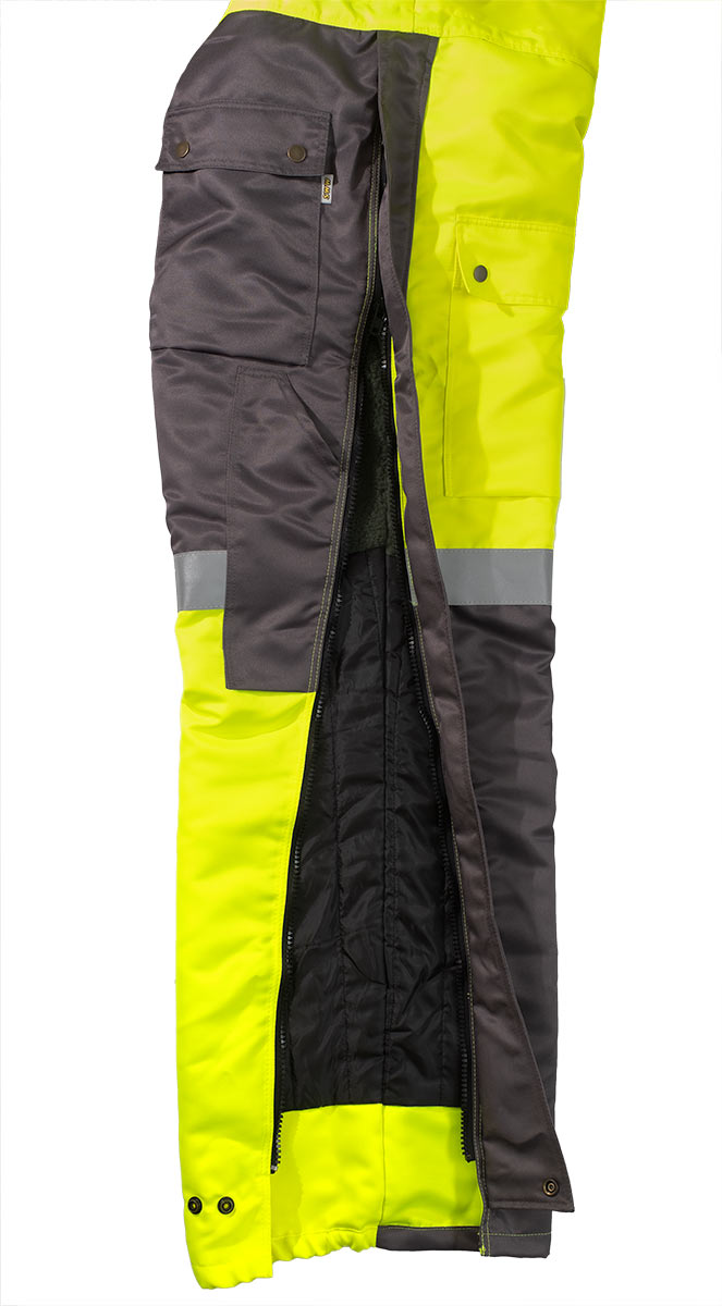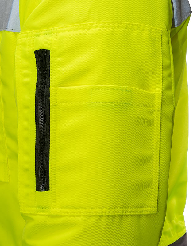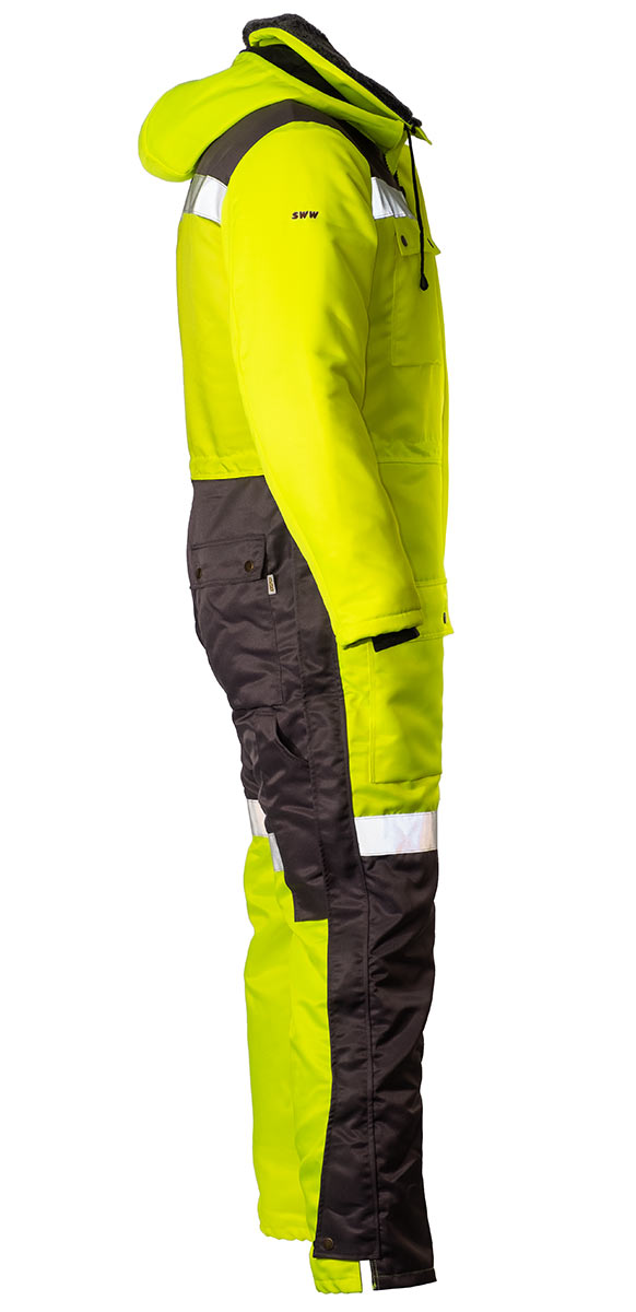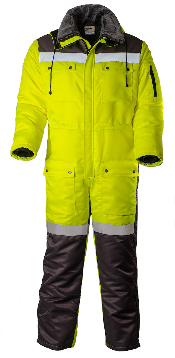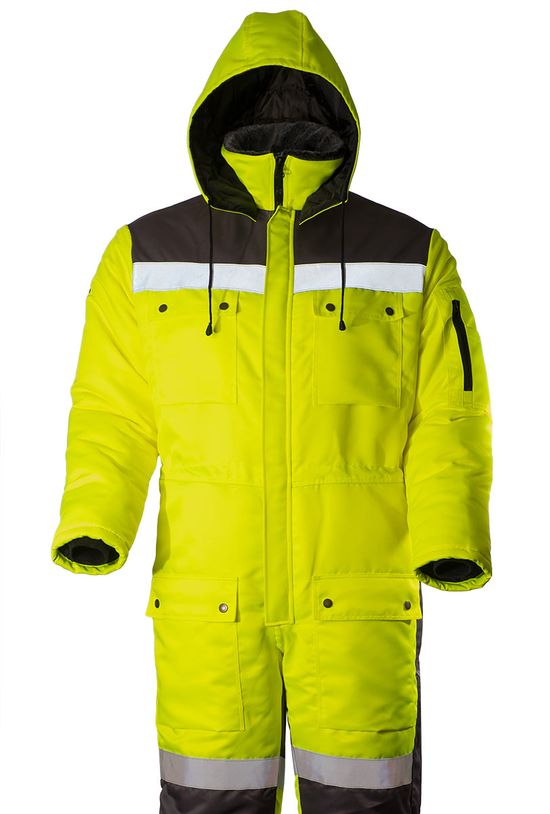 Штанины с боковыми молниями, чтобы комбинезон было легче надевать и снимать. В семи карманах найдется место для телефона, документов и других необходимых вещей. Трикотажные резинки рукавов защитят от продувания, а капюшон от ветра и снега. Вставки из ярко-желтой ткани и световозвращающие ленты сделают человека более заметным в темное время суток или при плохой погоде.