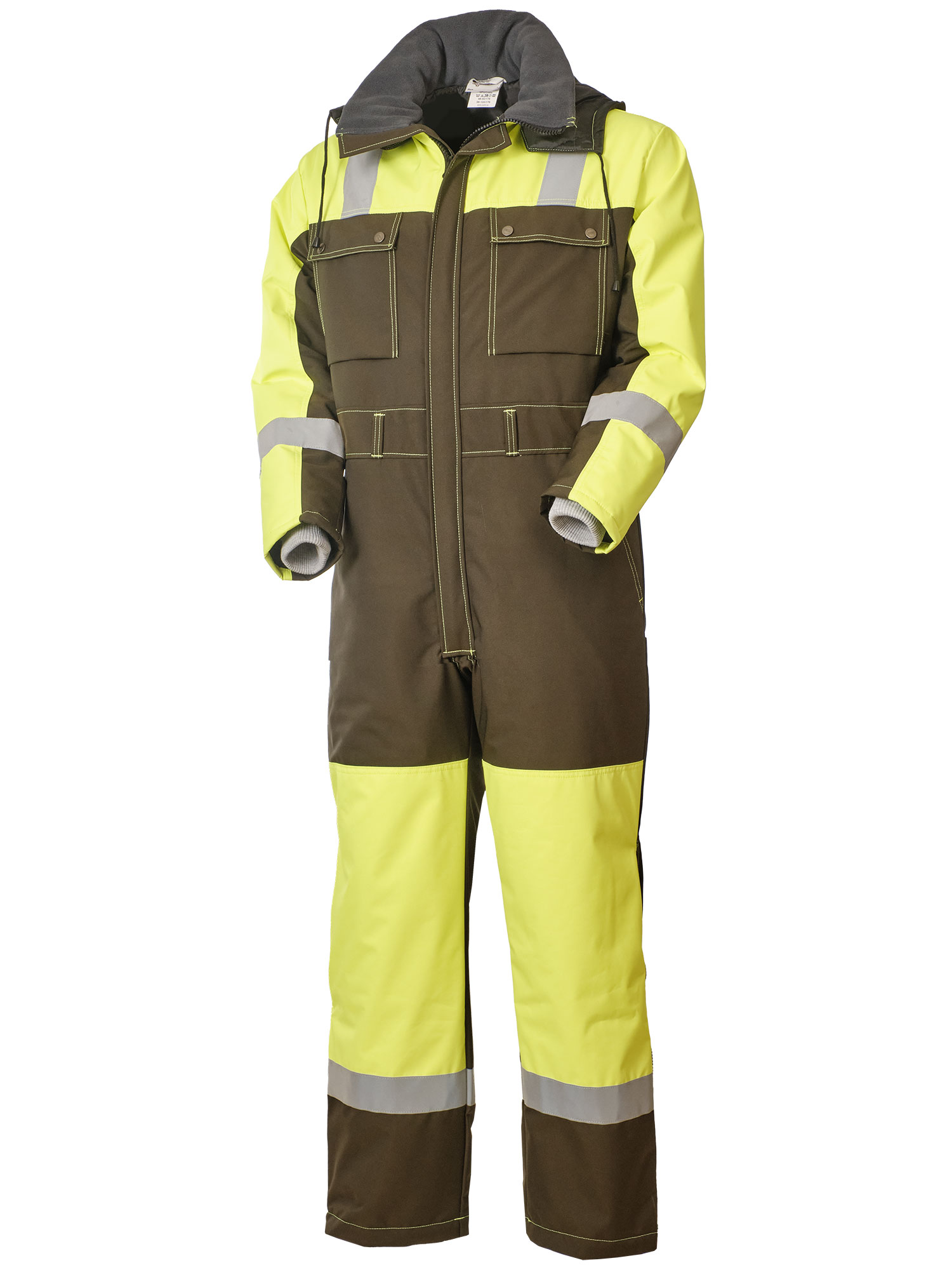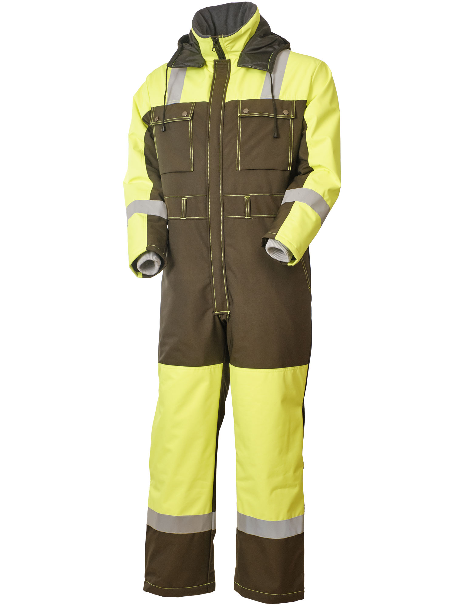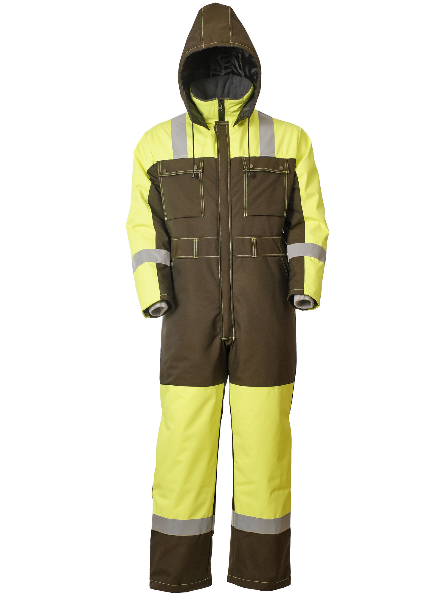 Рабочий зимний мужской комбинезон двухцветный 888N-OXF-64/71 на стеганой подкладке. Низ у штанин с молниями, чтобы можно было регулировать их ширину в зависимости от надетой обуви. В шести карманах найдется место для телефона, документов и других необходимых вещей. Трикотажные манжеты рукавов защитят от продувания, а капюшон от ветра и снега. Световозвращающие ленты и яркая расцветка сделают работника более заметным в темное время суток или при плохой погоде.