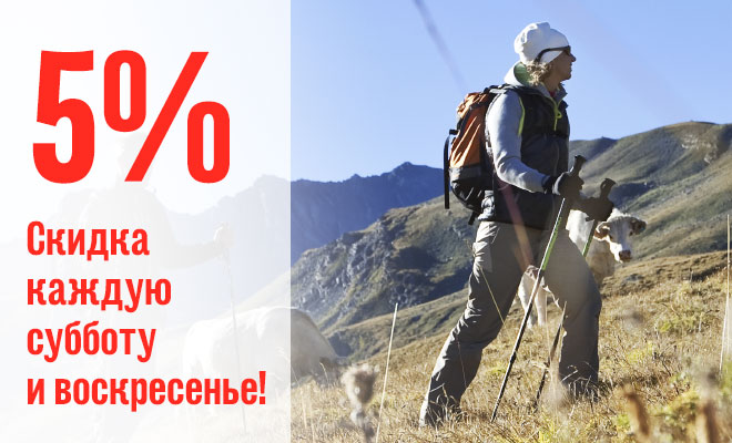Каждый покупатель может получить скидку 5% на заказ, сделанный в выходные дни — субботу и воскресенье. Для этого достаточно оплатить заказ картой любого банка онлайн на нашем сайте.